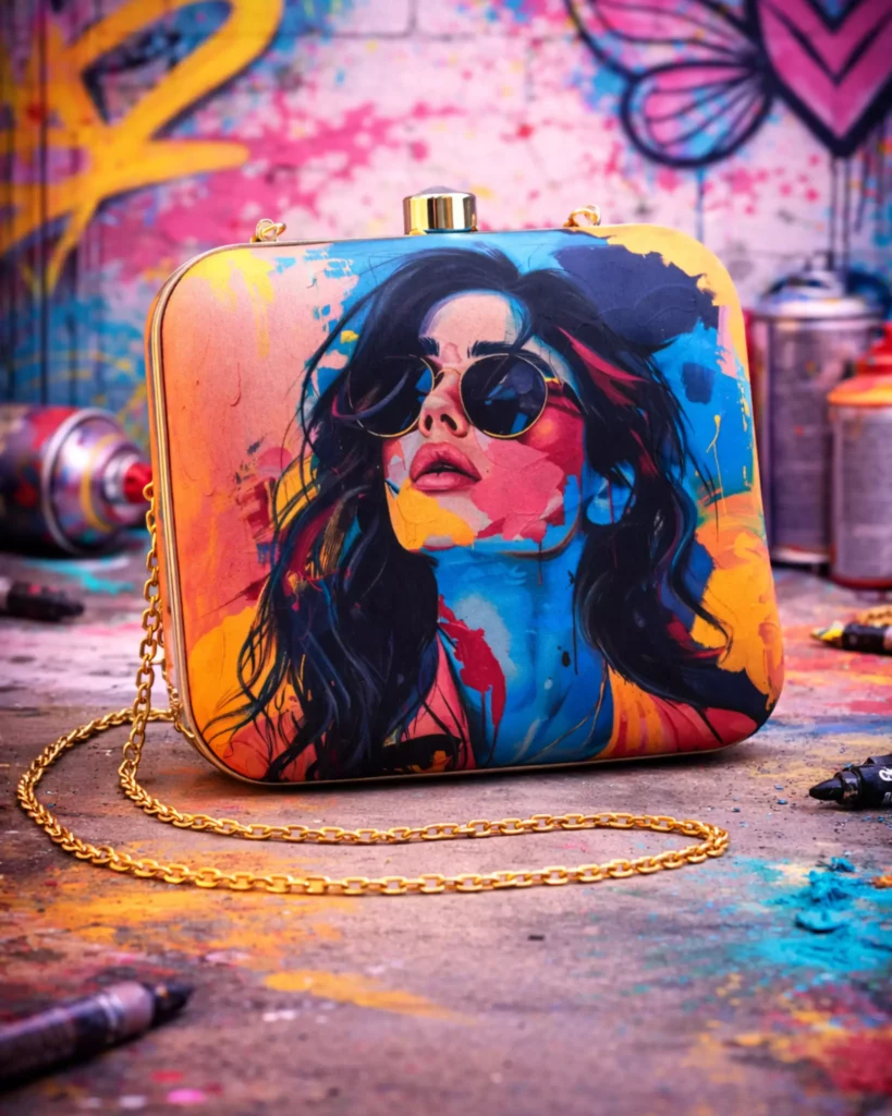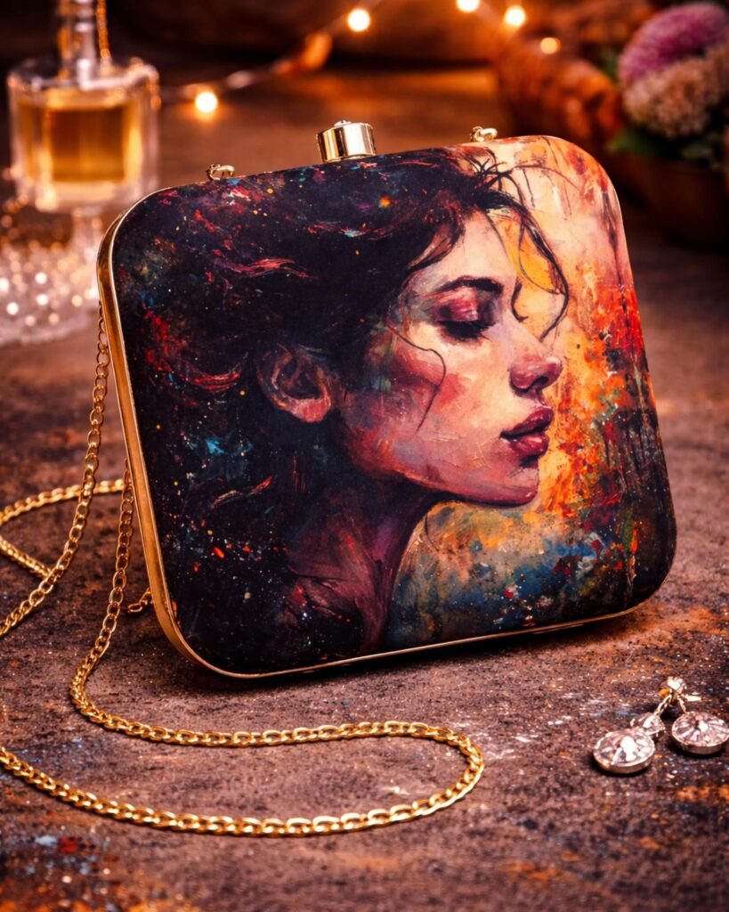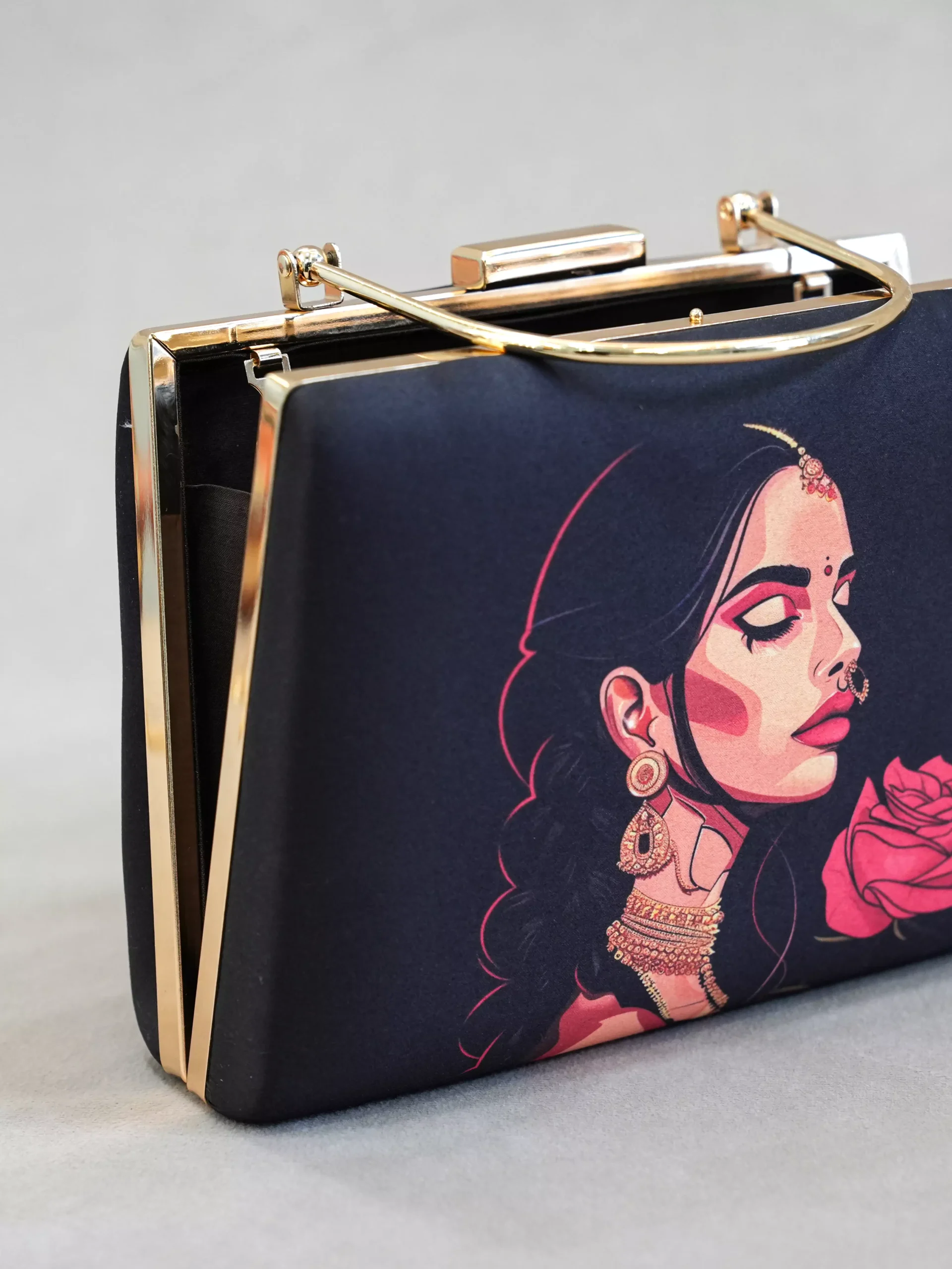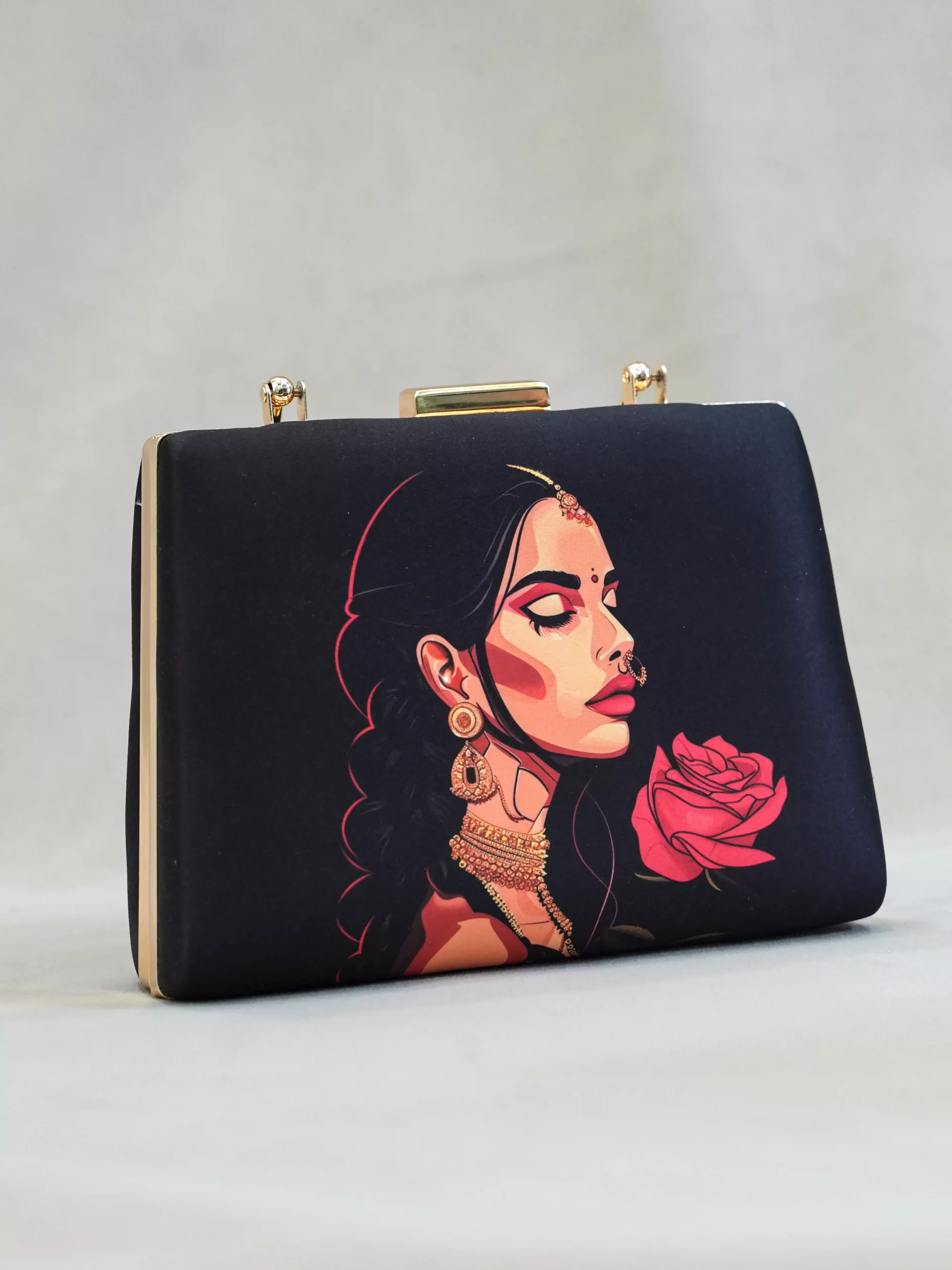 This beautifully designed Ethnic Portrait Clutch is a statement piece for women who appreciate art, tradition, and modern elegance. The bag showcases a striking illustrated Indian woman with intricate jewelry details and a bold red rose, making it a perfect blend of culture and contemporary fashion.